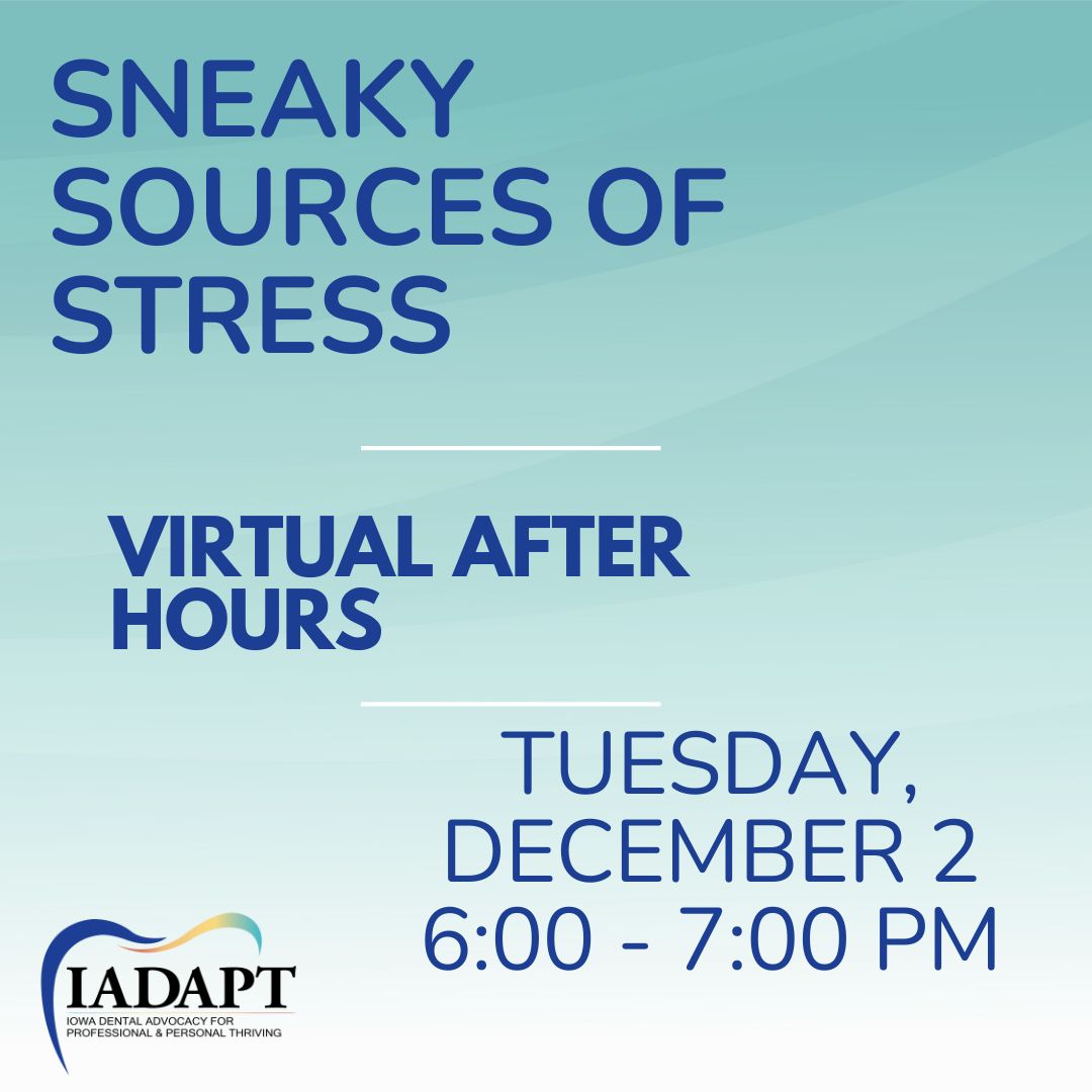 The ADA recently published that 82% of dentists feel major stress in their careers. You or a colleague are likely impacted by this. In response, the IADAPT program was designed to provide Iowa dentists with a free, confidential service that integrates executive coaching and therapy.
